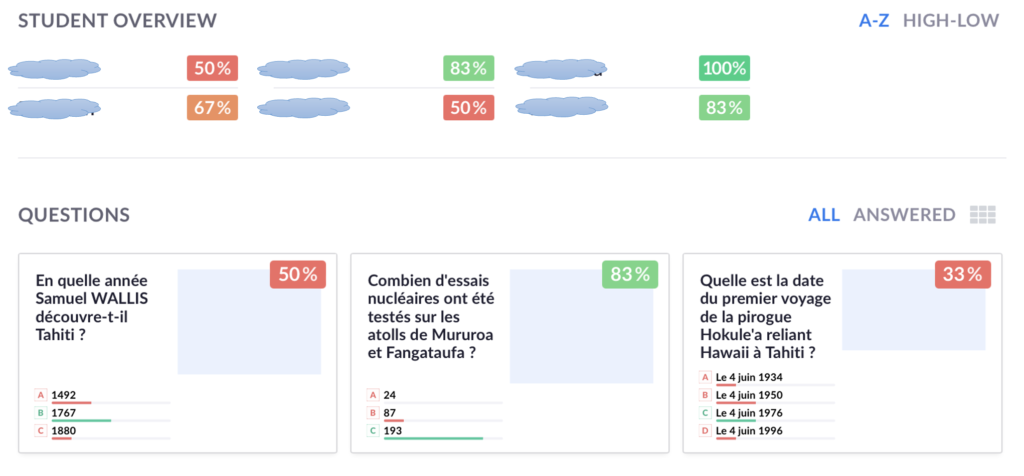 L'application Plickers mémorise les réponses des participants et établit des pourcentages de réussite aux questions posées mais aussi par élève.